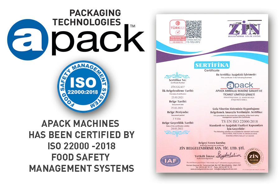 APACK Machineries certified by ISO 22000 Food Safety And Management Systems.