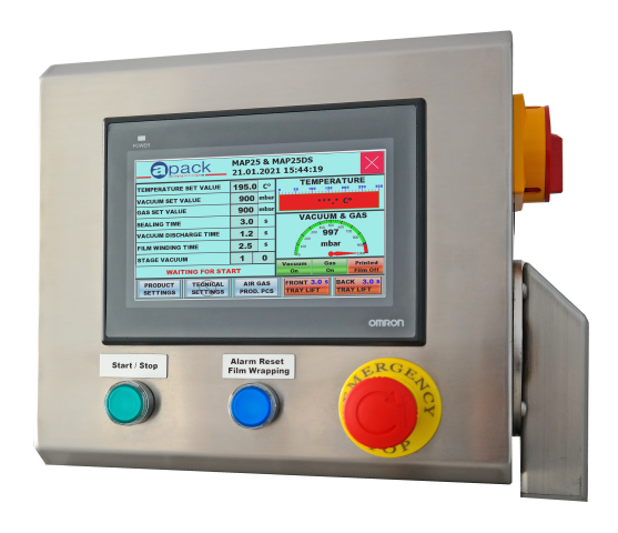 MAP25 Cardboard ambalaj makinesinin kalıpları istenildiği zaman değişebilmekte ve makine standart kapatma, MAP kapatma veya SKIN özelliklerine kolaylıkla dönebilmektedir. Çok fonksiyonlu PLC ünitesinin dokunmatik renkli ekranı sayesinde makinenin bütün özellikleri kontrol edebilmektedir.